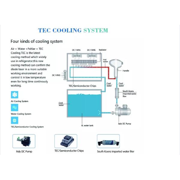 TEC(Thermo- electric cooling) cooling system the best stable cooling system a perfect macth for laser machines, protecting Laser bar and increasing the continuous working period of machine to 24 hours continuous work. Preventing the burning risks.